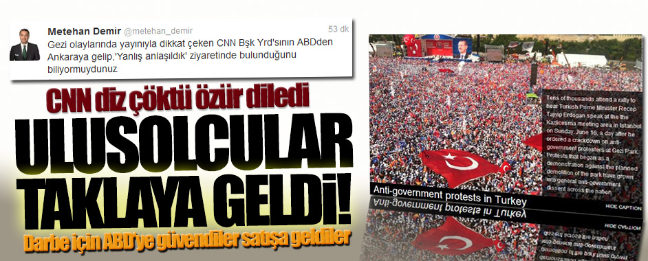 “Gezi olaylarında yayınıyla dikkat çeken CNN Bşk Yrd’sının ABDden Ankaraya gelip,’Yanlış anlaşıldık’ ziyaretinde bulunduğunu biliyormuydunuz. CNN International’ın Başkan Yardımcısının Ankaraya gelip ‘yanlış anlaşıldık üzgünüz’ demesi ‘ABD bileti kesti’ saçmalıklarının da iflasıdır.”
