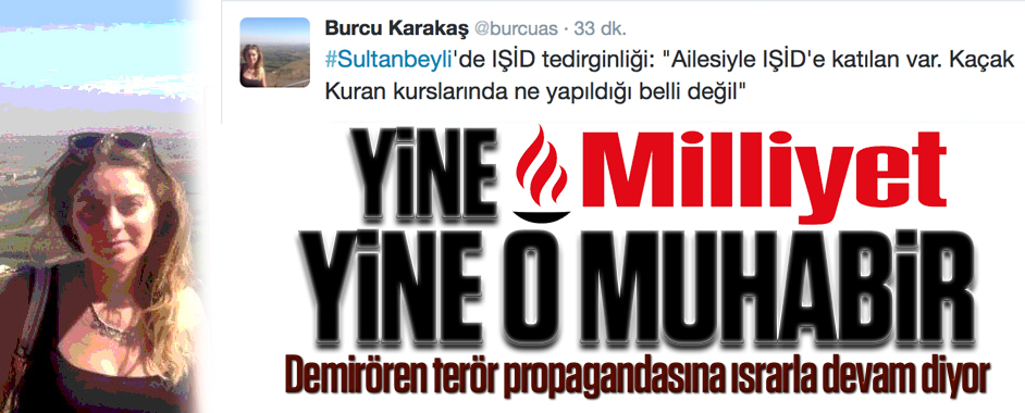 MEDYAGUNDEM.COM- Burcu Karakaş Milliyet muhabiri olmasına rağmen sol terör örgütlerinin propagandasının yapıldığı Evrensel’de de yazılar yazıyor, Twitter’dan HDPKK’nın avukatlığını yapıp, Türkiye’yi “IŞİD’i destekleyen ülke” gibi göstermek için alçakça algı operasyonlarına katkı sağlıyordu.