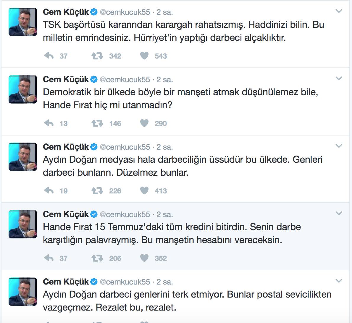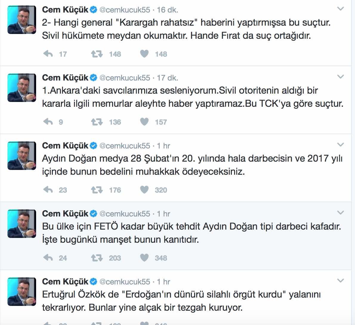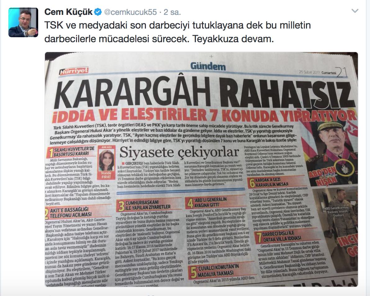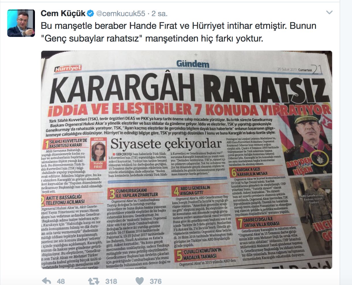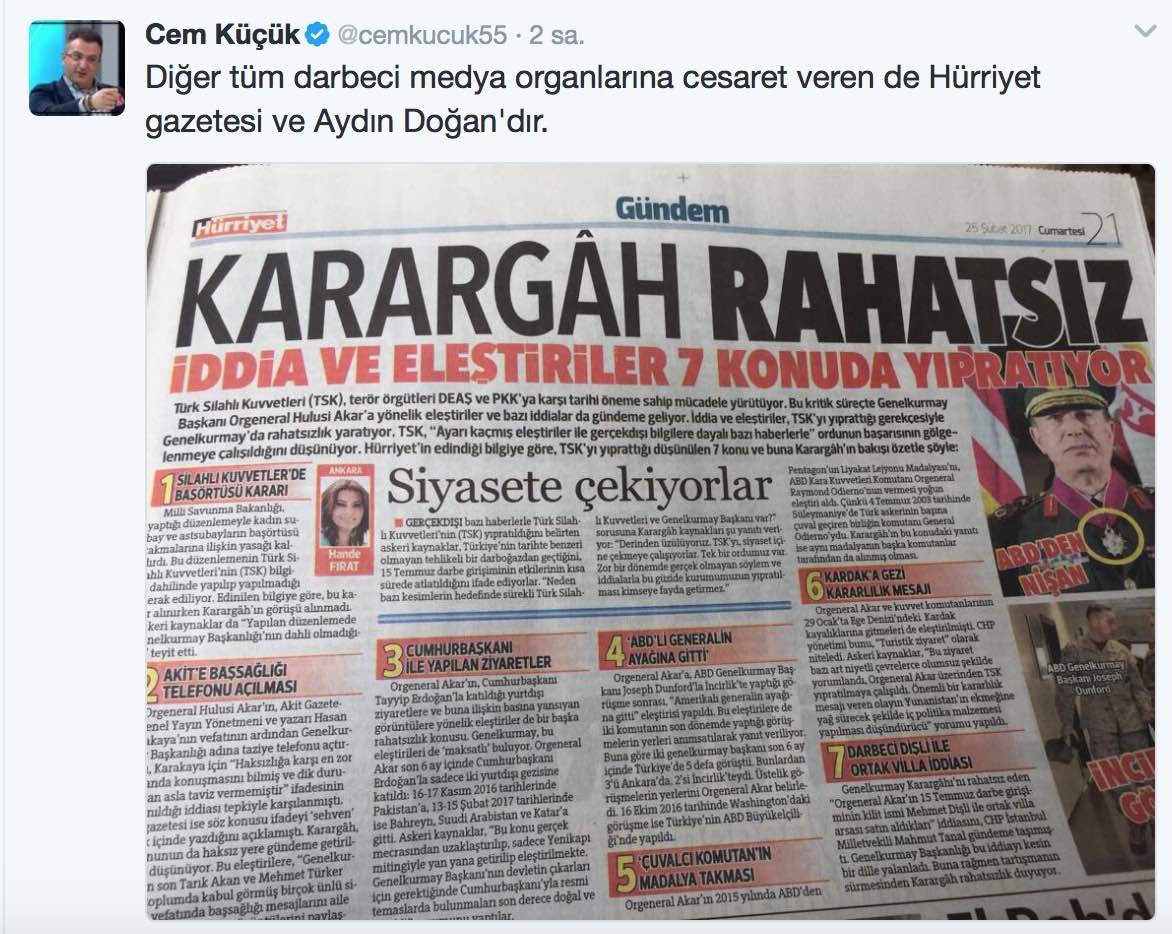 Aydın Doğan bugün Hürriyet gazetesinde Hande Fırat imzasıyla “Karargah rahatsız” manşeti attırıp, açıkça darbe kışkırtırıcılığ yaptı. Aydın Doğan ve Hande Fırat için yargılansınlar çağrısı yapıldı.