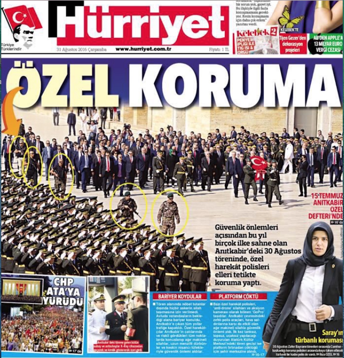 Haber Sedat Ergin yönetimindeki Hürriyet yazıişleri masası tarafından sinsice ve ince biçimde işlenmiş… Mesaj dolu… “Özel koruma” derken Hürriyet aslında FETÖ’cü darbe girişimi gecesi ölümden dönen Erdoğan’ın neden korunduğunu sorguluyor. Aslında manşetin alt metni şu; “Erdoğan korunmasın”… Yani FETÖ’nün yarım bıraktığı iş tamamlansın. Erdoğan şehit edilsin.