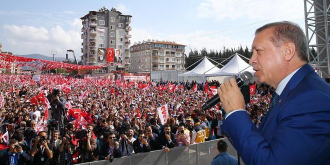* 16 Nisan Türkiye’nin topraklarına göz diken terör örgütlerine DUR diyeceği bir dönemin başlangıcı olacaktır. Hatay, 16 Nisan’da Büyük Türkiye için EVET diyor mu? Şimdi öyle bir cevap verin ki… EVET, EVET, EVET. Halep’teki insanlık suçu işleyenlerin kulakları işte sizin bu sesinizle çınlayacak. Büyük devlet olmak için büyük millet olmak lazım. Hamdolsun! Bizim milletimiz ne kadar büyük bir millet! İnşallah bu yolda hep birlikte yürüyeceğiz. Türkiye’nin demokrasisine burun kıvıranlara demokrasiye nasıl sahip çıkılacağını 15 Temmuz’da ortaya koyduk. O gece hep birlikte bunu Türk milleti ispat etti.