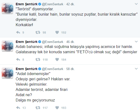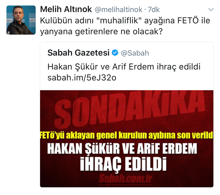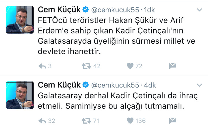 Sosyal medyada bir çok kişi Galatasaray’ın sadece FETÖ’cü Hakan Şükür ve Arif Erdem’in ihraç kararının ayıbı örtmeye yeterli olmadığını, Doğan Haber Ajansı muhabiri Kadir Çetinçalı’nın da Galatasaray’dan ihraç edilmesi gerektiğini vurguladı.