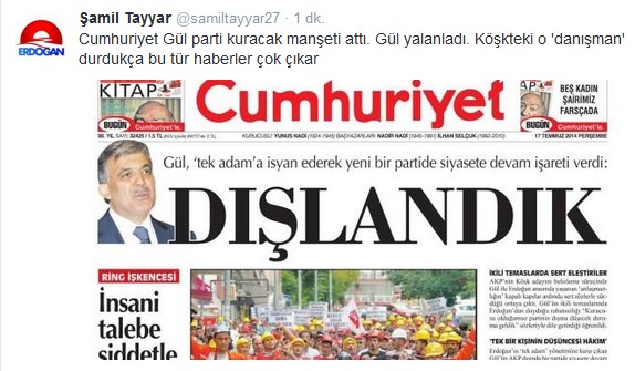 Cumhuriyet’in manşetinde yer alan “Dışlandık / Gül de Anladı” başlıklarıyla yayımlanan haberde Gül’ün yeni bir parti kuracağı iddia edildi.